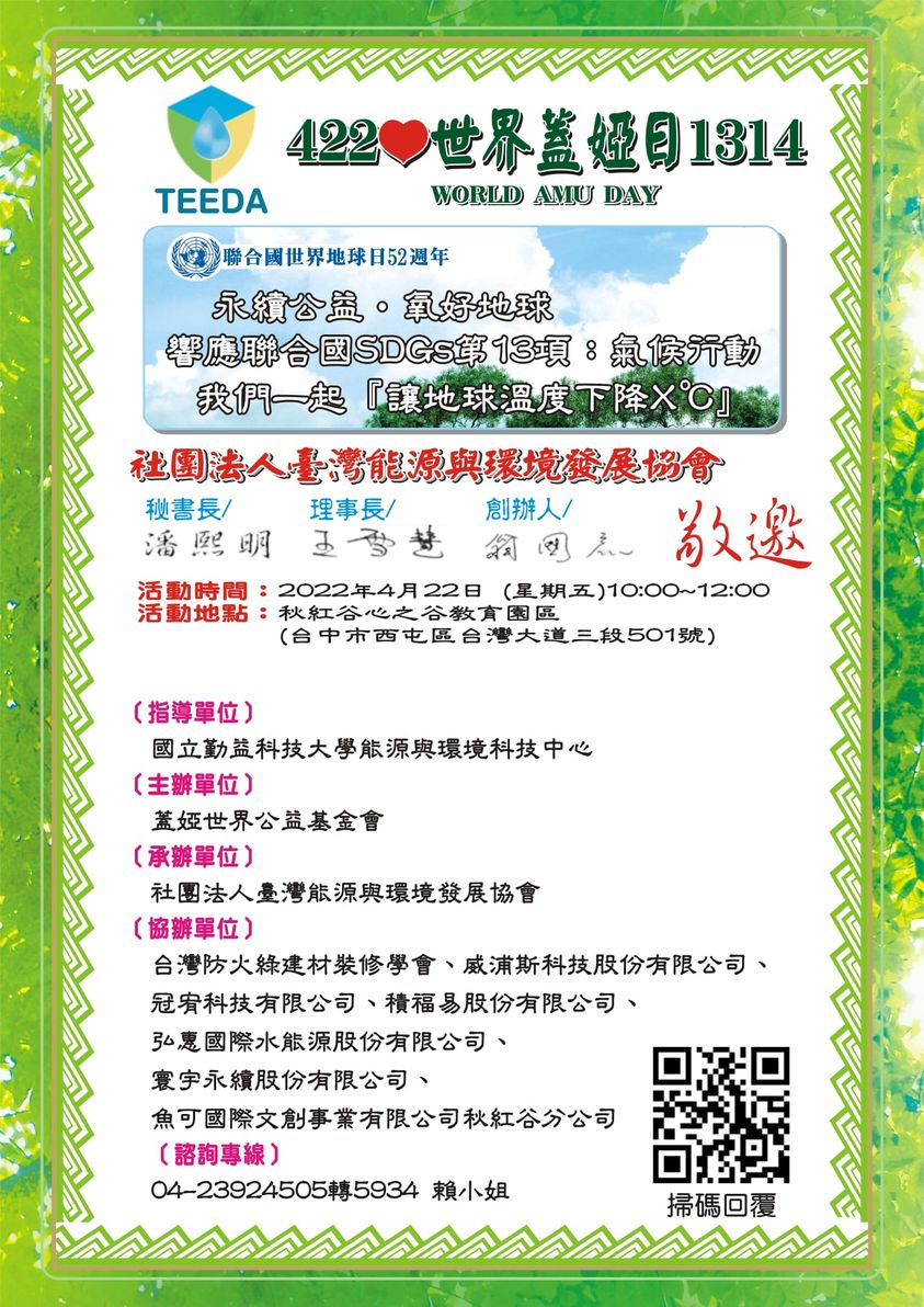 為響應聯合國世界地球日52周年,社團法人台灣能源與環境發展協會與蓋婭世界公益基金會共同舉辦【世界蓋婭日】公益活動。